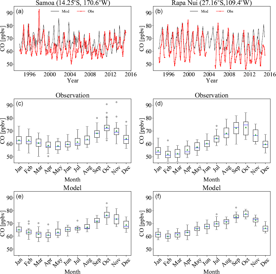 Figure 8: Time series (a, b) of observed (red line) and simulated (blue line) CO volume mixing ratios for Samoa (left) and Rapa Nui (right). The seasonal variability is depicted in box plots as shown by observations (c, d) and the simulation (e, f) for CO for the same stations. Boxes show the 25th to 75th percentiles of the data. Whiskers show the 0th and 100th percentiles, excluding outliers. Circles show outliers, the green triangle is the average, and the blue line is the median of each monthly distribution.